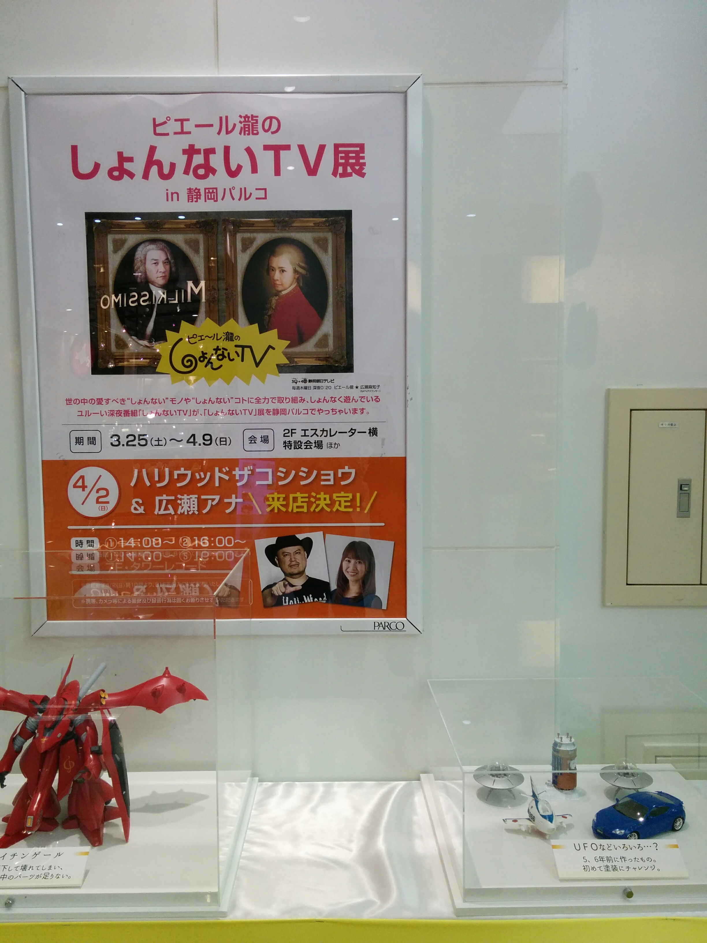 静岡のローカルでは大人気しょんないTVの展示展を見にパルコまで まぁ見てない人にはなんの面白みのない展示ですが番組のファンからしたらあの企画で出てたのが置いてあるって感じで大喜び 等身大?みたいな看板と一緒にパシャリ 地方局アナの広瀬さんの作成したプラモデルを堂々展示してあるのも笑えました 若者が多く通るパルコの入口付近で写真は勇気がいりました #しょんないTV #広瀬 #ピエール瀧