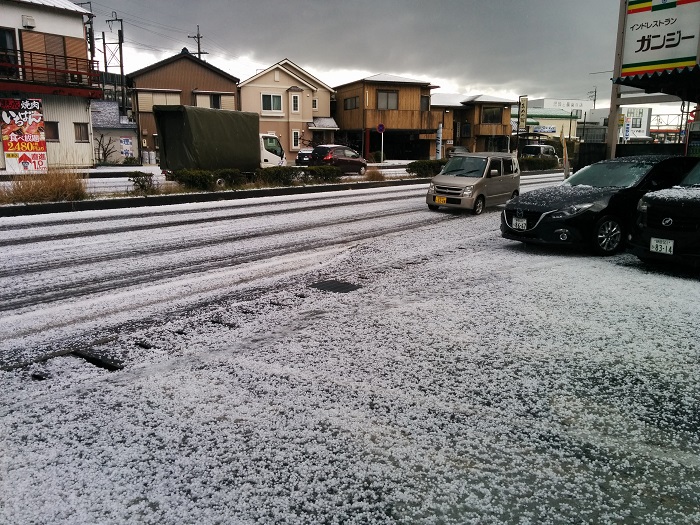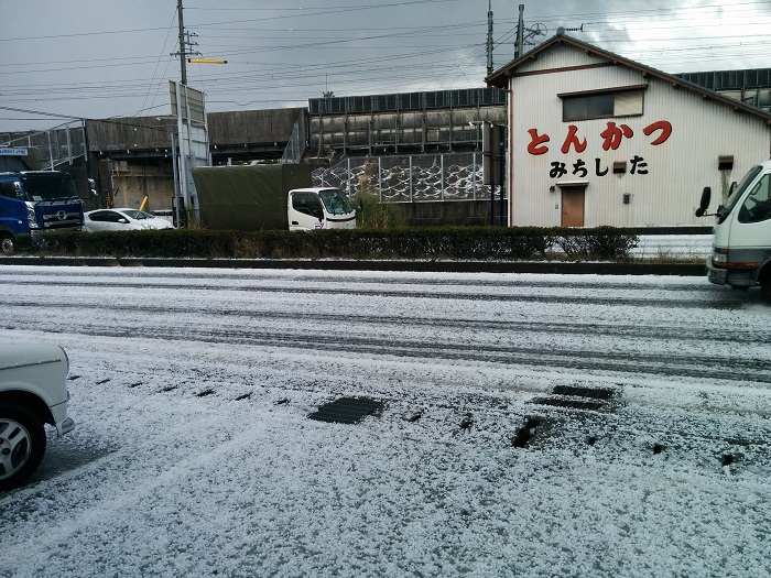 焼津がすごいことに 少し遅い昼ごはんを食べて帰ろうと思った瞬間凄い雷が鳴ったあと音を立てて大粒の雹が降ってきました 瞬く間に地面に積りあたり一面雪景色 でも実は雹 車ではしって大丈夫なのか???もしかしたら雪道みたく滑るのか? よくわからないのでしばらくお店で待機 すぐに道路の雹も溶けてきたので安心して帰宅しました